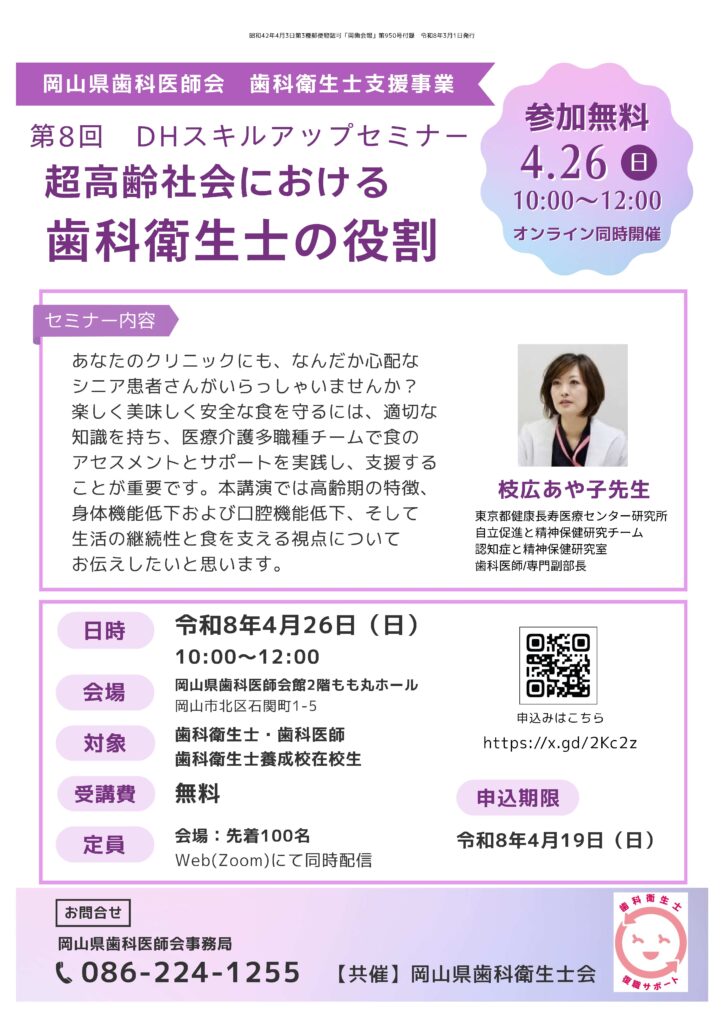 なお、本研修会は、日本歯科衛生士会第5次生涯研修制度の単位付与対象外となります。予めご了承ください。